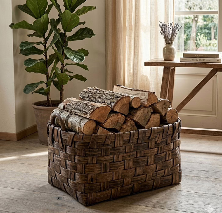 La legna per il tuo camino? Perfettamente accatastata su questa solida cesta porta legna utile dentro casa, è perfetta anche in taverna.