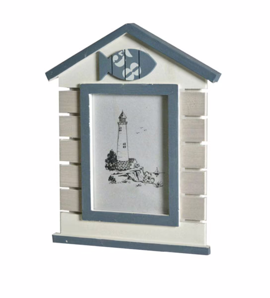 Portafoto da tavolo in stile nautico a forma di casetta del pescatore. Realizzato in legno con finitura a listelli e dettagli in azzurro polvere, presenta una graziosa decorazione a forma di pesce sulla sommità. Ideale per arredare ambienti in stile coastal o shabby chic questo portafoto trasforma i tuoi ricordi in un complemento d’arredo fresco e originale.