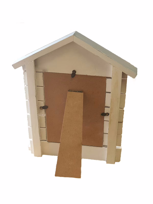La struttura è realizzata con un effetto a listelli orizzontali in bianco e sabbia, impreziosita da dettagli in azzurro polvere che profilano il tetto e la cornice centrale. Il tocco finale è dato dal piccolo pesce decorativo applicato sulla parte superiore, che richiama immediatamente la vita nautica.
